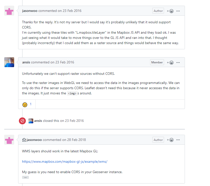 读下来的大致意思是:mapbox 加载WMS是需要读取 image里的数据,但只有服务器允许跨域的情况下我们才可以这么做。而LeafLet 不需要读取数据,所以可以直接加载。
