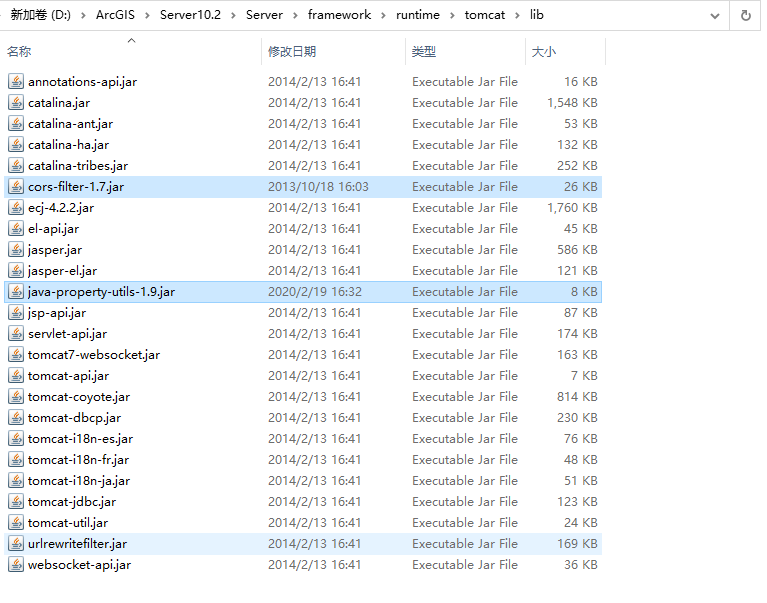 cors-filter-1.7.jar以及java-property-utils-1.9.jar这两个jar 包用于设置Tomcat的跨域。找到ArcGIS 安装目录下的